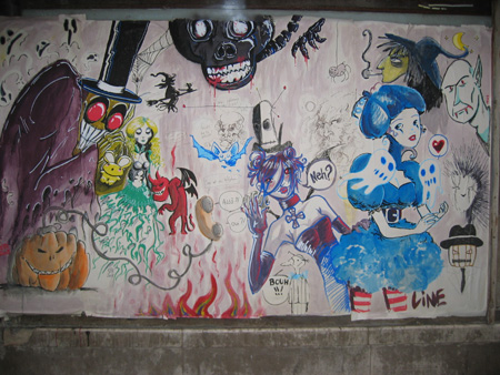 Oui enfin bon, n’exagérons pas. Froid et temps pourri. Comme les auteurs réfugiés à l’intérieur de la librairie n’avaient pas de place assise pour dessiner (et pas beaucoup de dédicaces en commande), ils ont particulièrement soigné la fresque sur le mur d’en face : elle illumine la rue.