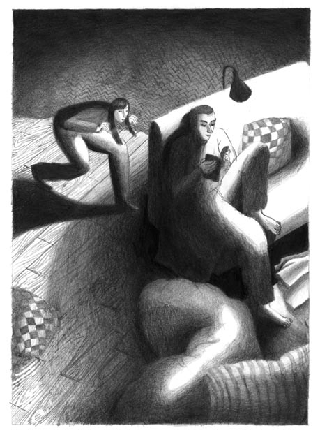 Est-ce une bande dessinée ? Non, pas au sens classique du terme, les pages se tournent sans mettre en scène les mêmes protagonistes, images sans paroles parfois très réalistes, parfois oniriques, parfois symboliques. Mais oui, c’est quand même une bande dessinée parce que les planches ne se succèdent pas au hasard, instantanés qui explorent la progression de la relation amoureuse aujourd’hui en occident, jeunes adultes dans un environnement familier, de la rencontre, du désir, du sexe à l’attente, au désarroi, à la rupture.